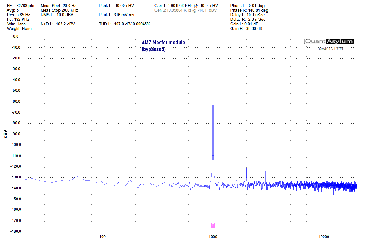 The test was repeated with an AMZ Mosfet module, which was mounted in a 1590A box. It is also true bypass using the common blue 3PDT switch just as with the previous pedal tested. The results are practically identical. Minor differences in the 60Hz noise are likely due to the internal wiring of the pedals, but in either case, are so low as to be below the threshold of hearing.