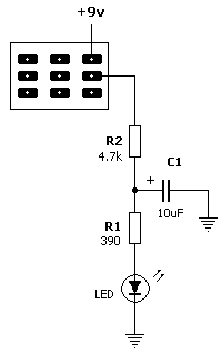 This offensive noise can be eliminated by the addition of two components which make a delay circuit which will slow the turn-on of the LED and limit the current surge.