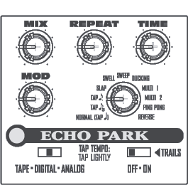 Based on the DL4 Delay Modeler, Echo Park is loaded with models including Analog, Tape, and Digital Delay. Different delay patterns such as slap, ping pong, swell, and sweep can be adjusted with the twist of a knob, and the Mod dial can be tweaked for even more variations. Also features Tap Tempo and stereo ins/outs. The following, very thorough review was generously contributed by Mark Hammer.