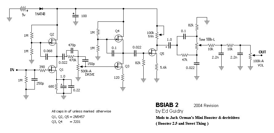 The Mini-Tubes was 4 gain stages but several players who tried it remarked that the gain was over the top, so I then cut it down to 2 gain stages. Finally, Aron Nelson revised some values in my basic two-booster design (Booster 2) and the Booster 2.5 was born. It served as a starting point for many similar amp-like pedals that were to follow.