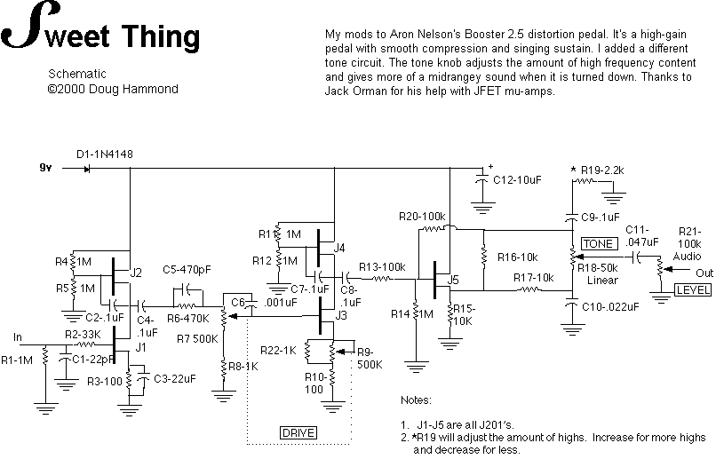 The dual mini-booster designs were not my first amp-like pedals, since more than 10 years before, I has created the Fet Muff, which has 4 jfet common source stages in series voiced like a classic Bassman amplifier. This method of cascading simple jfet amplifers to make amp simulators has also found its way into many commercial designs and still sounds really nice for lower gain pedals.