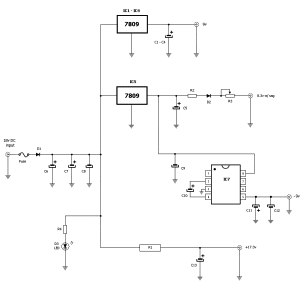 Multiple filtered and regulated dc voltages are available on the board. IC1 through IC5 are 7809 regulators but I usually substitute a 7812 regulator for IC1 so that I have a 12v output too.