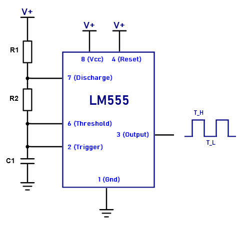This calculator is used to calculate the frequency of the output square wave from a classic 555 timer circuit. Input the selected values for R1, R2 and C1. Hit the Calculate button for the answer. The default values are a good starting point, and will give an answer close to 1k Hz when the Calculate button is pressed.