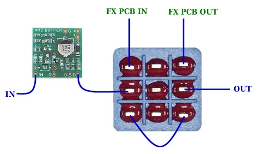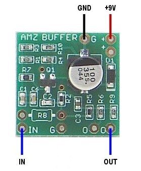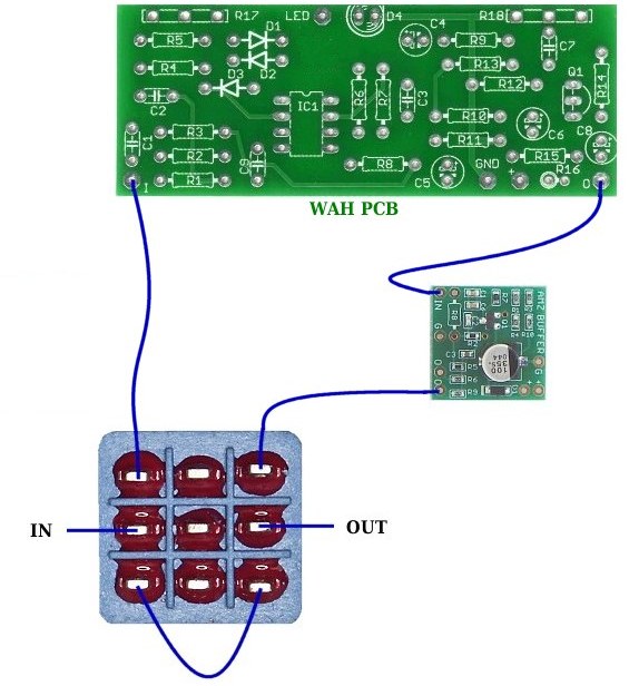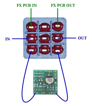 The AMZ pre-assembled buffer module is small enough that it can conveniently fit into a small corner inside the pedal. Use only one of the output pads (do not parallel them) so that the build-out resistance of the buffer is high enough to prevent unwanted interactions with the wah or fuzz. Power and ground connections to the buffer are required but not shown in this wiring diagram.